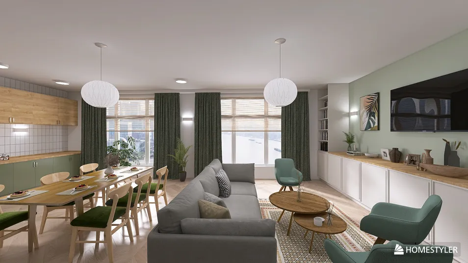 Bright and airy Scandinavian-style apartment featuring natural materials like wood and stone, complemented by fresh green accents. Lush plants bring life to the space, creating a harmonious blend of modern minimalism and nature. Perfect for those seeking a serene and stylish sanctuary.