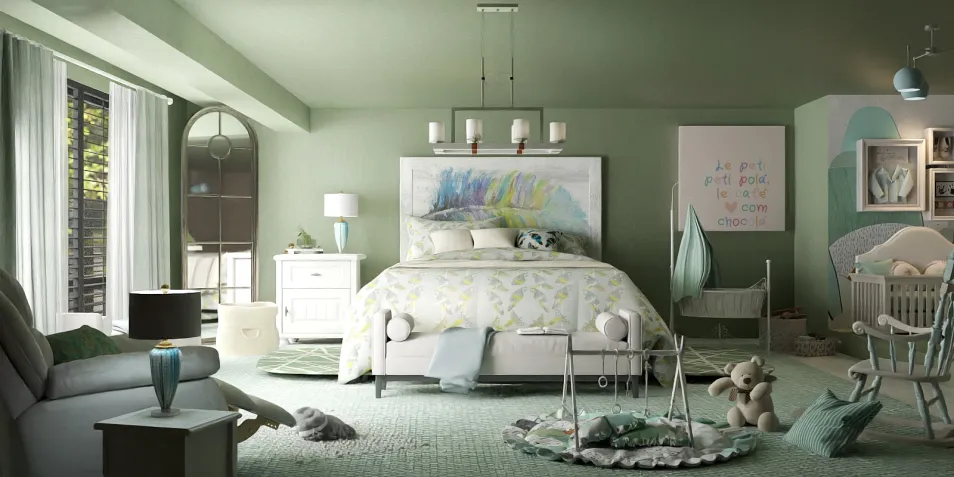 The Serene Nest Suite" offers a tranquil haven tailored for a first-time mother and her little one. The bedroom is a sanctuary of calm, cloaked in soft green tones that soothe and rejuvenate. A white-framed bed with delicately patterned bedding serves as the centerpiece, accompanied by a cozy armchair and a side table for moments of quiet reflection. The adjoining nursery is seamlessly integrated, designed with love and practicality in mind. A charming crib takes center stage, flanked by a changing table and a playful mat adorned with toys, ensuring comfort and functionality. Natural light pours through sheer curtains, casting a gentle glow that highlights thoughtful decor—a colorful painting above the bed and a whimsical framed piece in the nursery. This suite artfully marries elegance with nurturing warmth, providing a shared space where every moment between mother and child is cherished. It's more than a room; it's a heartfelt retreat. 🌿✨
