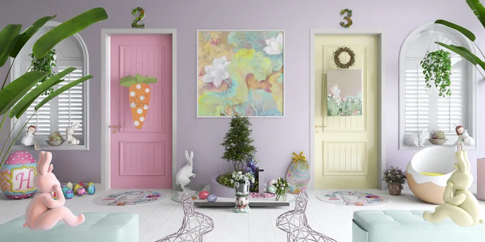 The hallway is a vibrant celebration of Easter joy, crafted collaboratively by tenants for a friendly contest. Each door is a festive gateway: a cheerful pink door showcases a carrot-shaped sign exclaiming "Happy Easter," while a sunny yellow door boasts a wreath and a charming bunny painting set in a lush field. Between the doors, a petite tree adorned with Easter eggs and bright blooms creates a whimsical focal point. The lavender-hued walls serve as a soft, inviting canvas, complemented by a colorful floral painting above the tree. Circular rugs with playful Easter patterns brighten the white-tiled floor, inviting footsteps to linger. Throughout the hallway, bunny figurines, painted eggs, and fresh greenery evoke a sense of renewal and delight. Light filters gently through windows with white shutters, flanked by trailing plants, enhancing the scene's airy charm. This design radiates warmth and community spirit, bringing the joyful essence of Easter to life.