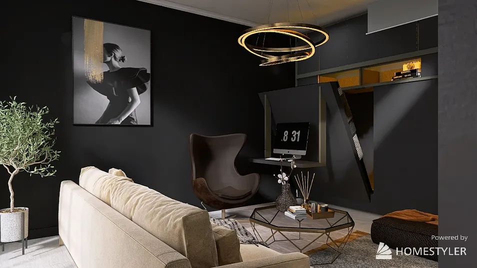 In this project I tried to create a small apartment in a multifunctional and practical space. In the living room I placed a piece of furniture that has a bed inserted that can open and a desk when the bed closes. The library is a door, it is the door that closes the bedroom/living room.