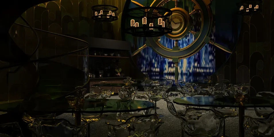 In the dim-lit sanctuary, a ship wheel spins, tethering time to whispers of homecoming. Glass tables ripple like memories, and shadows dance against walls woven with dreams, where every tick of the clock beckons the wanderer to return to the shores of the self.