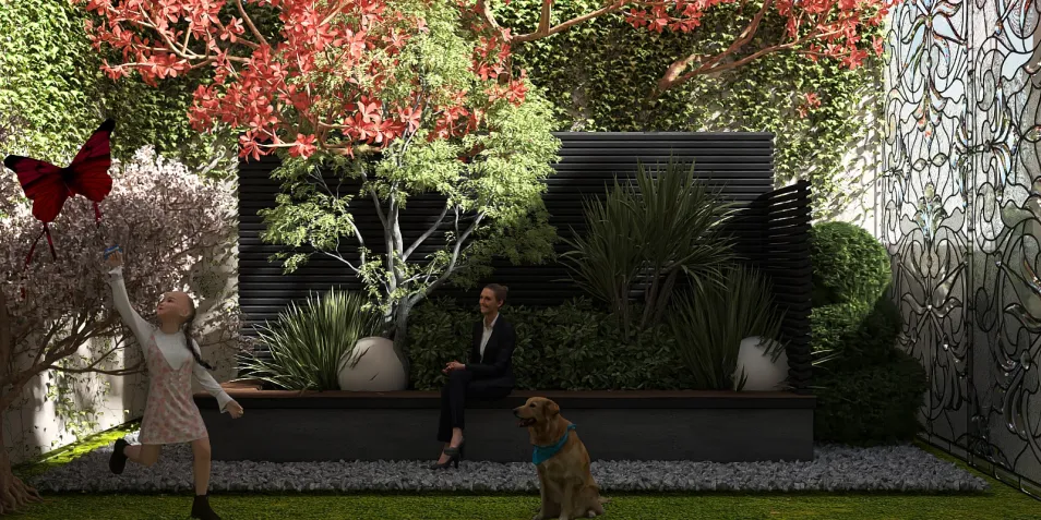 In a sunlit garden, laughter dances with the flutter of butterfly wings. A mother, serene amidst nature's embrace, watches her child chase joy, while a loyal dog rests at her feet, embodying the bliss of simple moments.