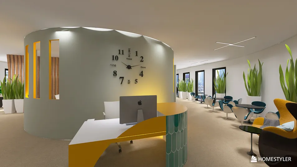 This office layout balances open workstations with curved private meeting areas, integrating natural light and greenery to create a productive yet inviting environment.