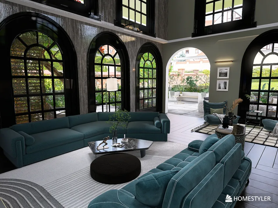 In a realm adorned with cool colors, this tranquil space invites summer breezes through grand arches. The gentle hues of teal and soft gray create a serene ambiance, perfect for lazy afternoons, where whispers of nature mingle with the comfort of modern design.