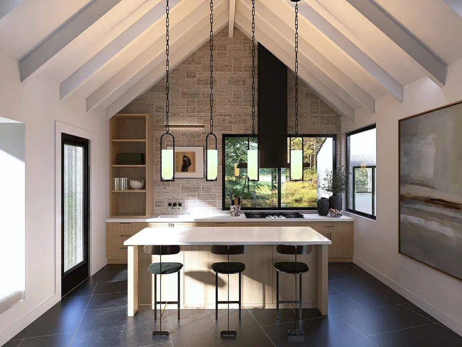 Three houses plotted along a slight grade. Experience the Main Kitchen & Living, Private Suite #1, Private Suite 32