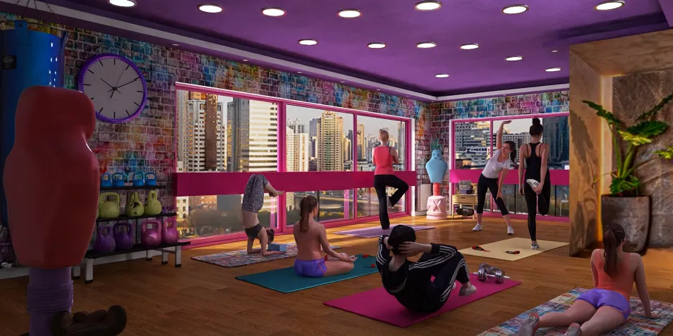 A vibrant and modern yoga space where energy meets serenity. With a graffiti-style brick wall, expansive city-view windows, and a mix of fitness equipment, this studio offers a dynamic setting for movement and mindfulness. The rich colors and urban aesthetic create an inspiring backdrop for yoga practitioners seeking balance in the bustling city.