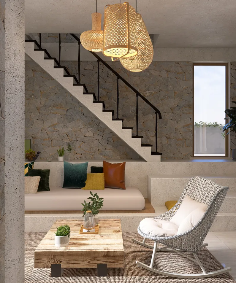 Villa Tropical is a project of a stone villa with 3 bedrooms and a height difference, in which there is a technical area and a heat accumulator. The tropical style is expressed in oriental notes, greenery, the use of natural materials, stone and wood, seasoned asceticism, while diluted with luxury elements, art and antiques.