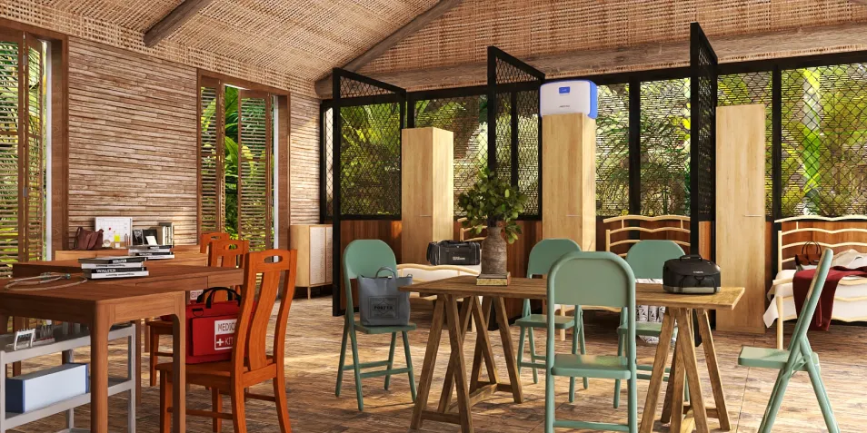 The design depicts the view of a volunteer's teacher and doctor dormitory in rural village.