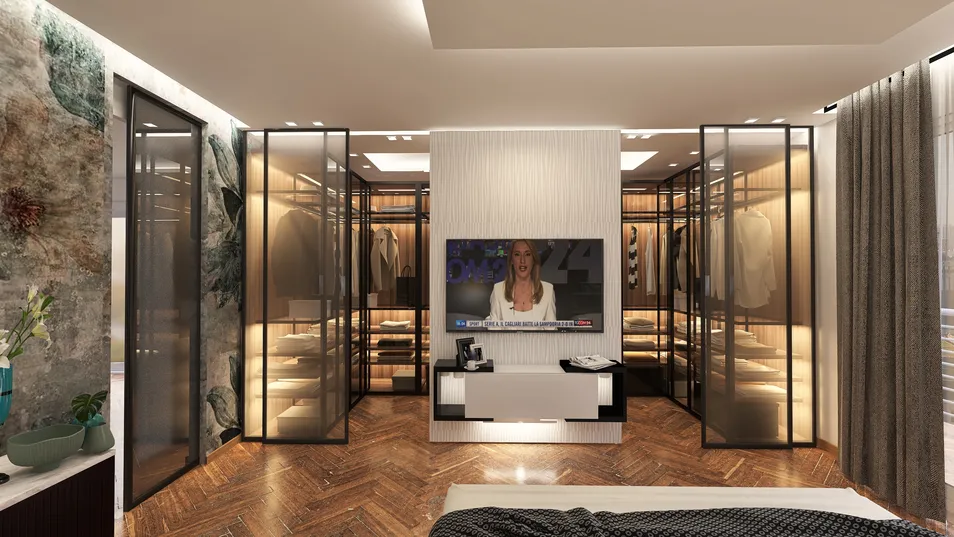Walter Tudisco interior designer , il sogno di ogni donna moderna e' possedere una bella cabina armadio luminosa ed elegante , uno spazio tutto suo per i suoi abiti . ecco il mio progetto online dove raffigura una camera da letto di design con una cabina armadio a vista con chiusura di 2 ante fisse e 2 ante scorrevoli in vetro h.260 . i vetri sono con tecnologia LCD e si possono scurare con un telecomando.
