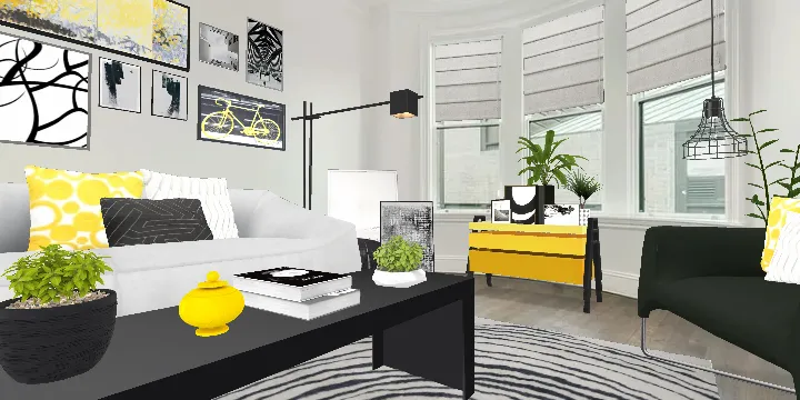 A mostly black and white living room in a city apartment, with bright pops of yellow and fresh greenery.