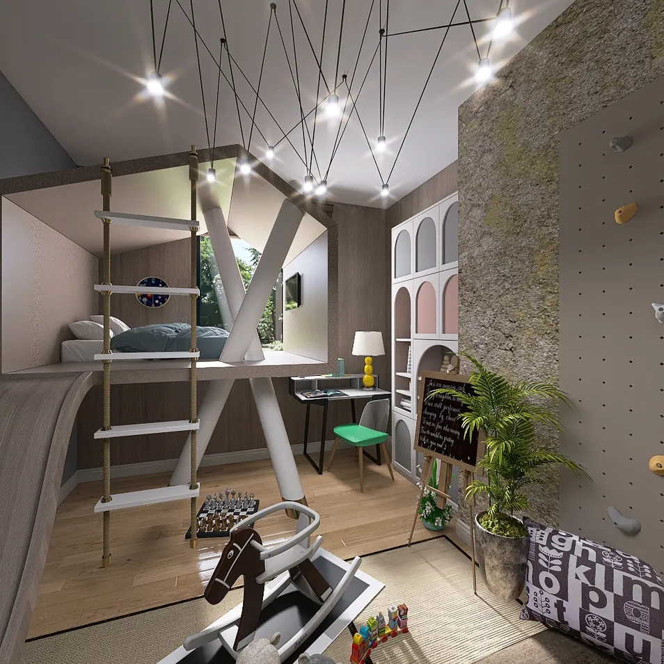 комната маленькая амбиции большие. В детстве в квартире делали палатку обычно на балконе и там играли, приносили еду , книжки игрушки, ели , только не было туалета, все как в большой квартире, это было свое пространство где взрослым не было места. Комната рассчитана на маленького по возрасту ребенка. В проекте 3 основные территории 1-домик на "дереве" с спальным местом и тв, 2- учеба -стол , доска , шкаф для одежды и игрушек 3- спорт на природе -скала и деревья