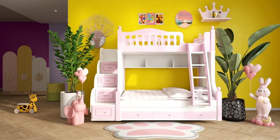 В этом ярком пространстве, где стены словно дышат весельем, каждое детское чудо обретает форму. Кровать-чердак, как замок из снов, приглашает к играм, а мягкие игрушки, подобно стражам, охраняют мир детства.