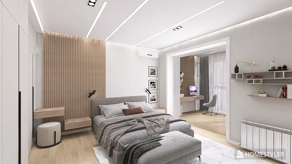 В этом пространстве минимализм встречается с теплотой. Деревянные акценты и мягкие текстуры создают атмосферу уюта. Каждый элемент, от гладких линий мебели до приглушенного света, словно шепчет о спокойствии, в то время как пустота стен тайком намекает на недосказанность.