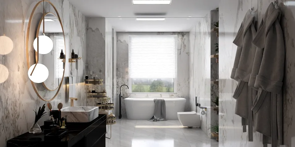 في هذا الحمام، تتراقص الأضواء على جدران من الرخام، حيث يفوح عبير الزمن وهدوء اللحظة. كأن المرآة تُعكس عوالم متعددة، بينما تتعانق الأشكال السائلة مع الفراغ، كما تتشابك المدن في كتب كالفينو. هنا، الزمن ليس خطياً، بل يتشكل ككتل من الوجود.