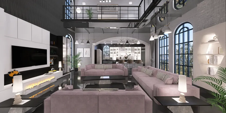 With this being a very large open space I decided to use black white and grey. For a pop of colour decided on the pink sofas and the floor is reflective black for a feeling of luxury.